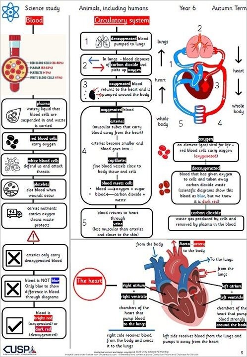By the end of Key Stage 2, pupils will (amongst other things) know, identify and explain the main parts of the human circulatory system and describe the functions of the heart, such as lungs, heart, aorta, pulmonary vein, left atrium, right atrium, left ventricle, right ventricle, arteries, veins and capillaries, oxygenated and deoxygenated, know, identify and explain the components and function of blood, such as plasma, red blood cells, white blood cells, platelets, nutrients and oxygen, know and explain the impact of diet, exercise, drugs and lifestyle on the way their bodies function, know, describe and explain the ways in which nutrients and water are transported within animals, including humans, know and explain how living things are classified into broad groups according to common observable characteristics and based on similarities and differences, including micro-organisms, plants and animals, know and explain that living things produce offspring of the same kind, but normally offspring vary and are not identical to their parents, know, identify and explaining how animals and plants are adapted to suit their environment in different ways and that adaptation may lead to evolution, know and explain how the brightness of a lamp or the volume of a buzzer is affected by the number and voltage of cells used in a circuit, know that light travels in straight lines to explain how objects are seen because they give out or reflect light into the eye, know and explain how dissolving, mixing and changes of state are reversible changes.